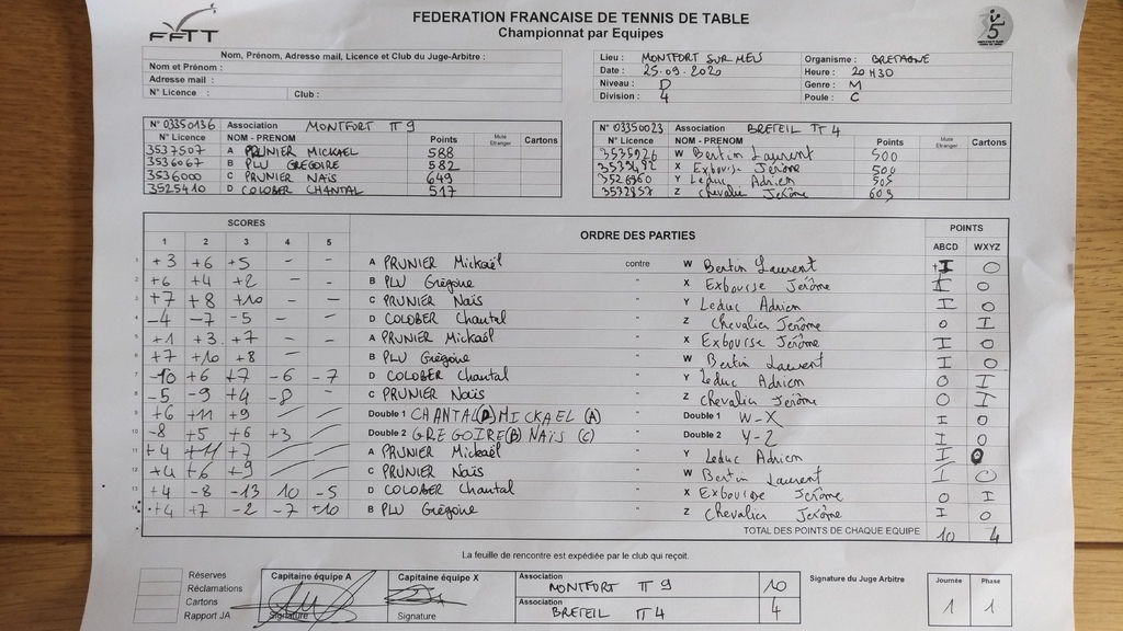 Championnat par équipe 1ère phase, 1ère journée / Contre Breteil TT4